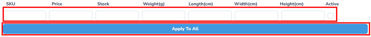 5. You need to set the price, stock, weight, length, width & height for each of the variants. If your product has the same price, stock, weight, length, width & height, you can use this section to fill in, and click on the "Apply To All" then the system will help you to fill in all boxes.