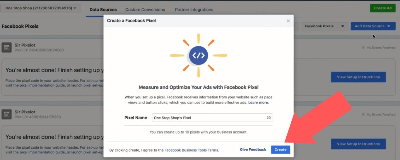 3. Masukkan nama untuk Pixel dan pilih "Create".