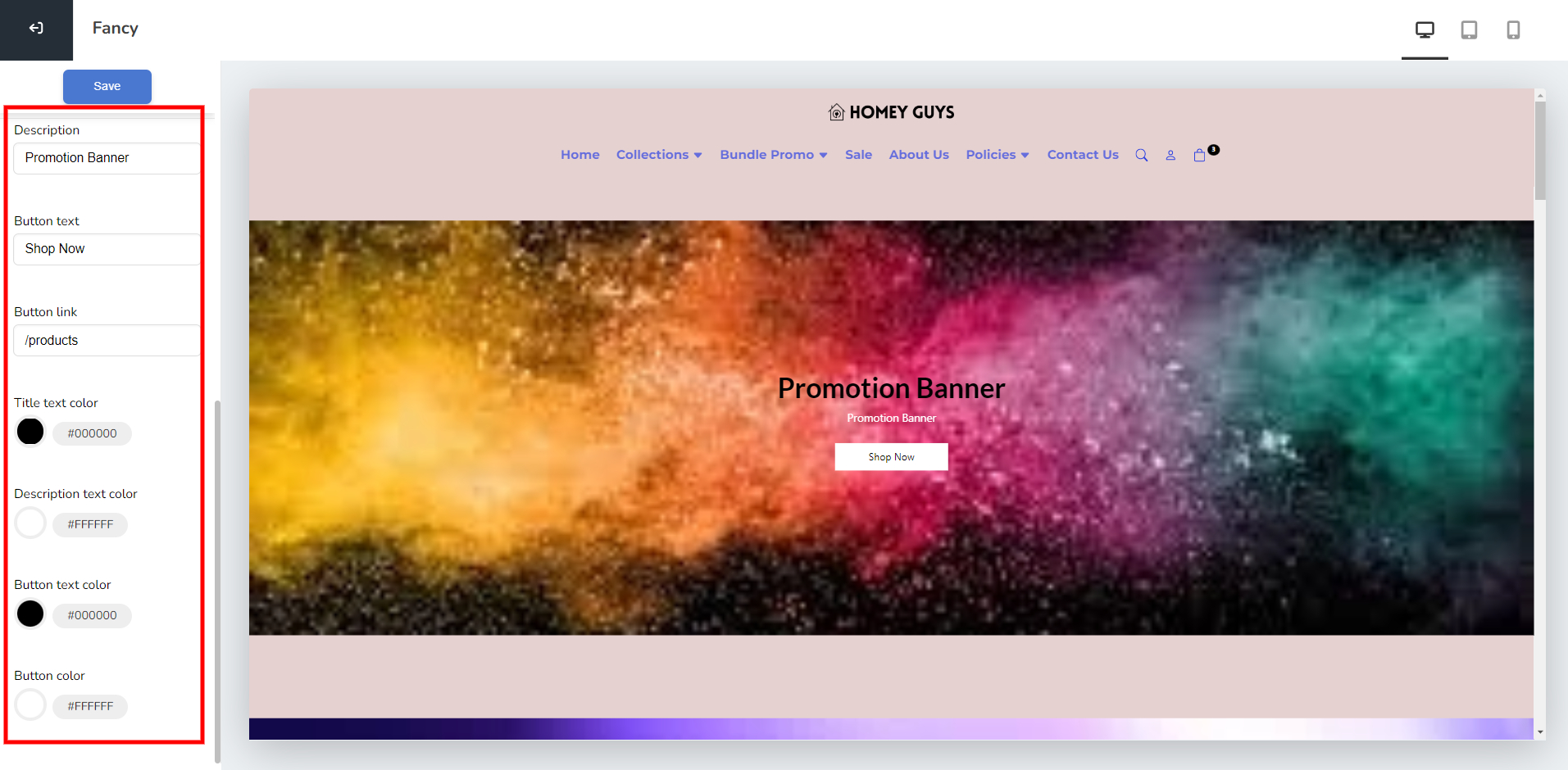 3. Click on the "Promotion banner" section and inside it you can edit the promotion background image, title, description, button text, button link, text color and the button color.