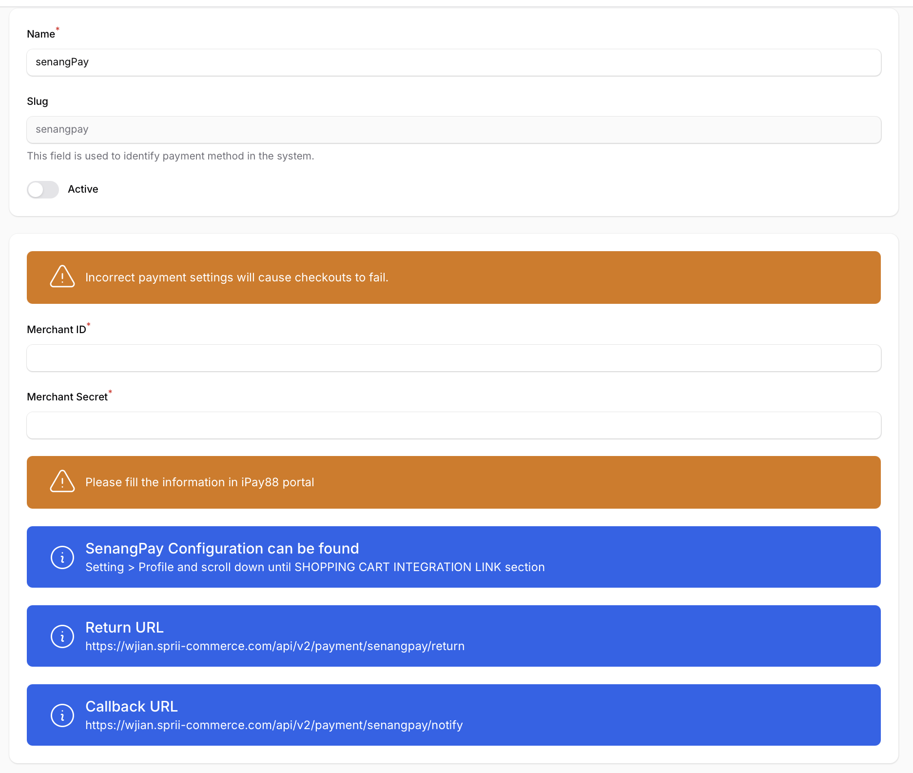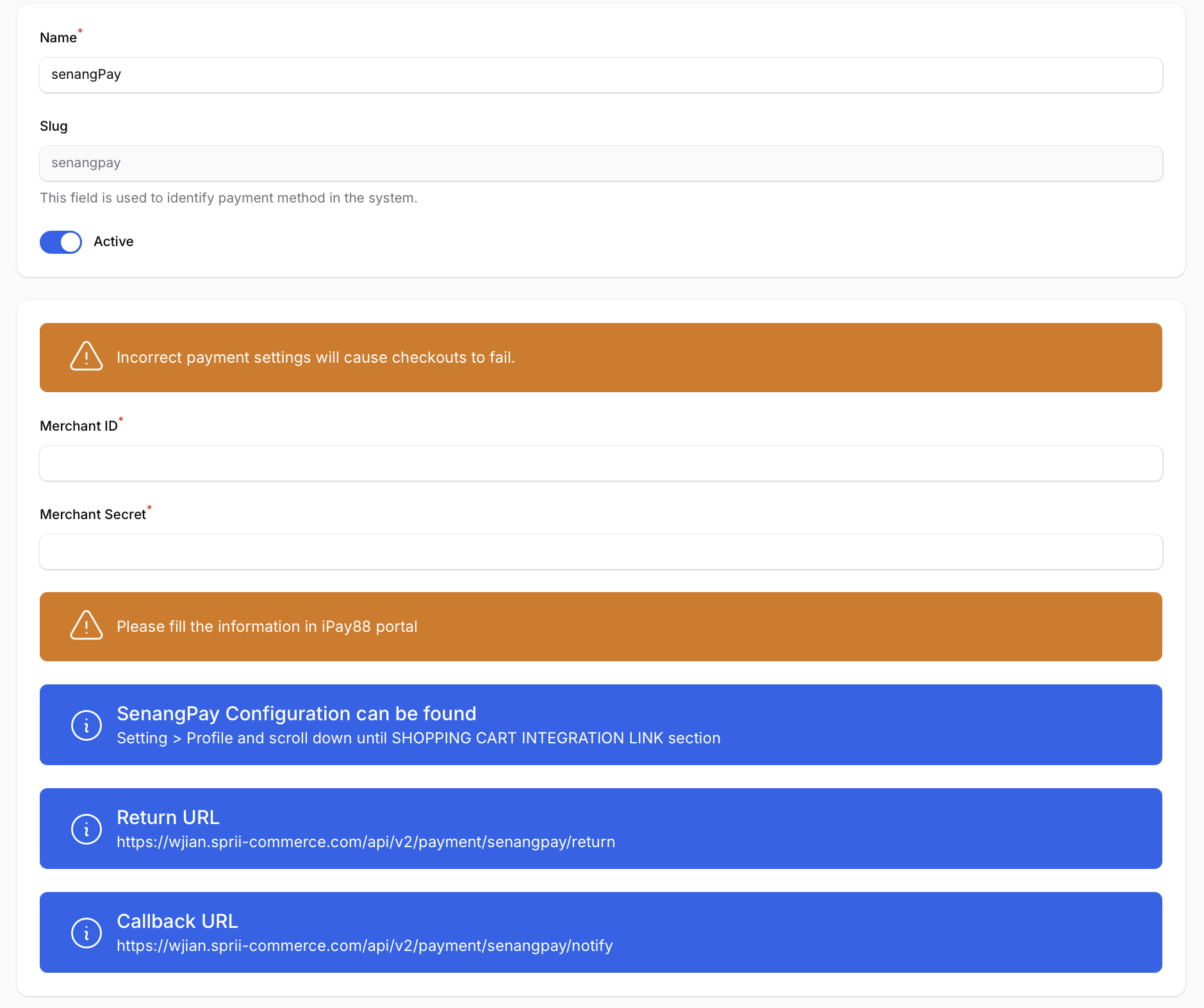 2. Setelah anda menerima Merchant ID & Secret Key, pergi ke SpriiCommerce admin panel > Settings > Payment Method > Edit. Tetapkan Merchant ID & Secret Key anda di sini dan klik "Update Payment Method" untuk menyimpannya. Selain itu, anda juga perlu mengisi Return URL dan Callback URL di portal SenangPay. Return URL dan Callback URL telah disediakan di bahagian bawah dalam kaedah pembayaran SenangPay.
