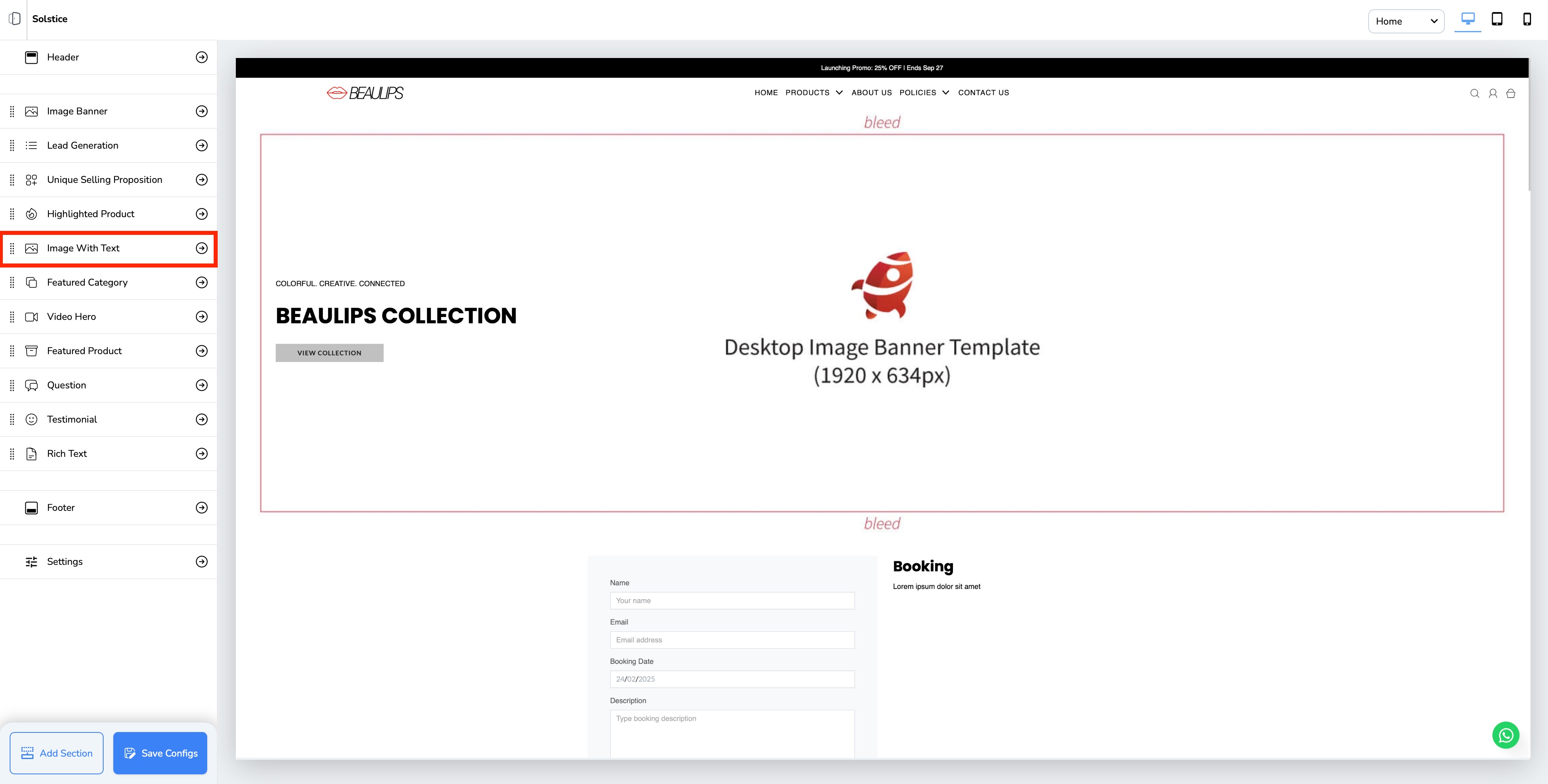 3. Go to "Image With Text" section, you can edit image of your desktop, tablet or mobile version, image position.