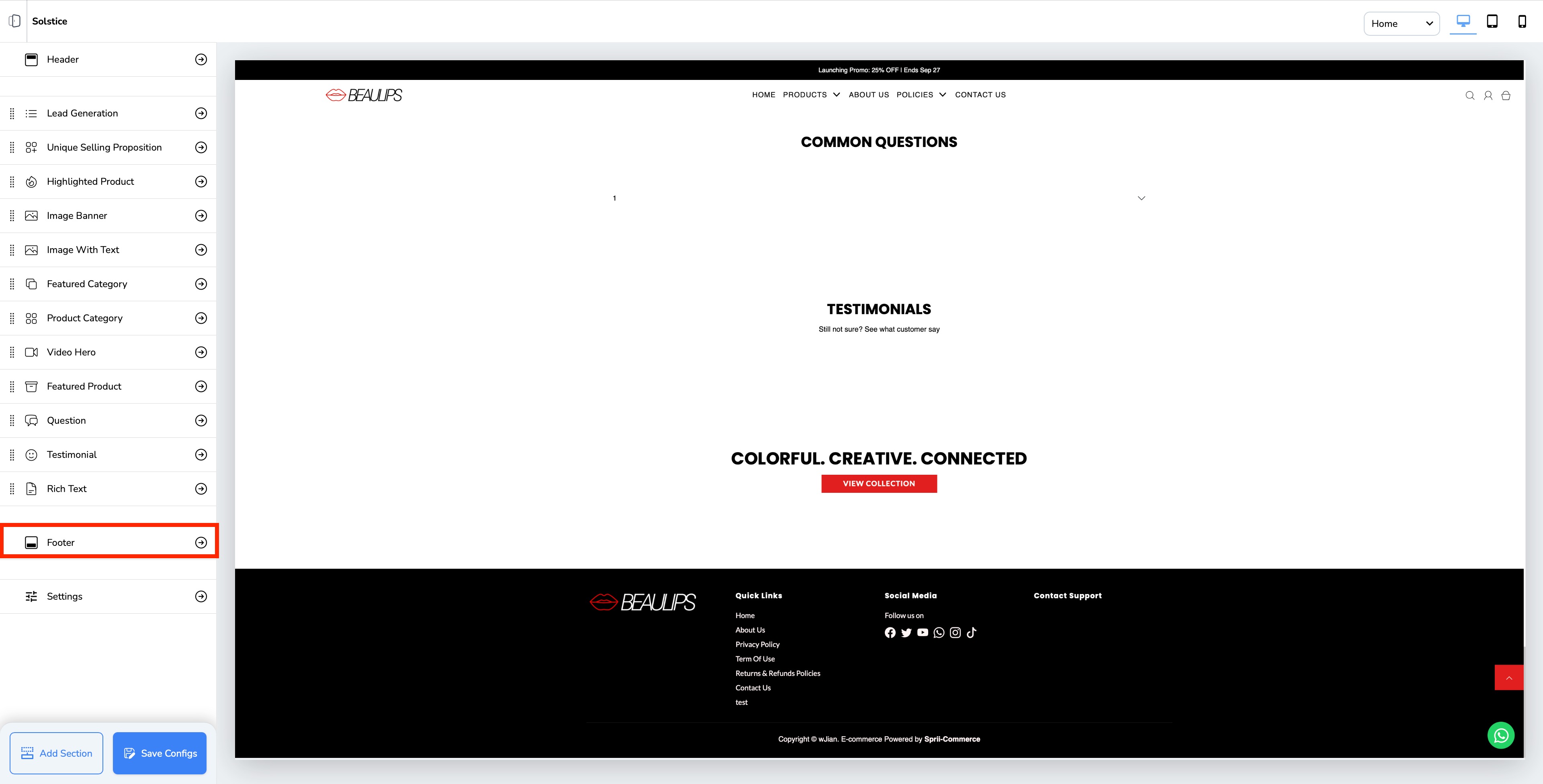 3. Go to "Footer", you can add Quick Links, Social Media, About Us and Contact Support.